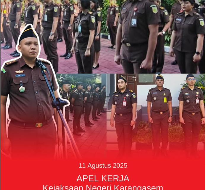 Senin, 11 Agustus 2025, bertempat di Kantor Kejaksaan Negeri Karangasem, Kepala Seksi Perdata dan Tata Usaha Negara Kejaksaan Negeri Karangasem, Apriando Simanjuntak, S.H., M.H., memimpin Apel Kerja yang diikuti oleh para pegawai pada Kejaksaan Negeri Karangasem.