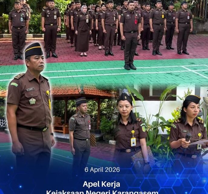 Senin, 6 April 2026, Kejaksaan Negeri Karangasem melaksanakan apel kerja rutin minggu pertama pasca Idul Fitri yang bertempat di lapangan Kantor Kejaksaan Negeri Karangasem. Kegiatan ini dipimpin oleh Kepala Sub Bagian Pembinaan Kejaksaan Negeri Karangasem, I Gusti Ngurah Lanang Saputra S.H., dan diikuti oleh seluruh pegawai.
