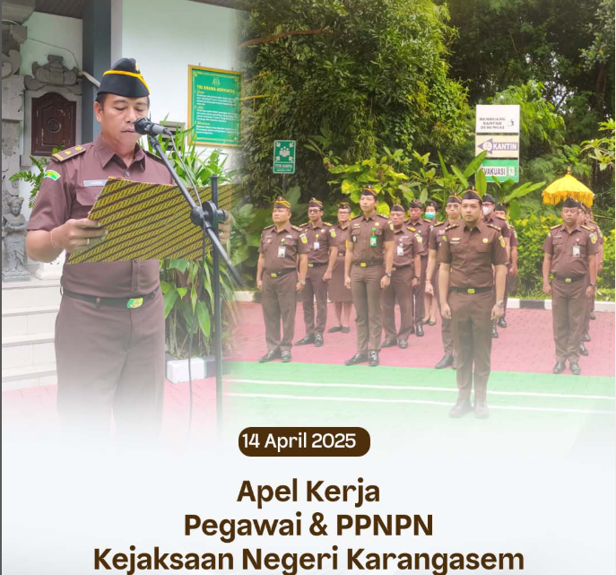 Senin, 14 April 2025, bertempat di Kantor Kejaksaan Negeri Karangasem, Kepala Subbagian Pembinaan Kejaksaan Negeri Karangasem, I Gusti Lanang Ngurah Saputra, S.H., memimpin Apel Kerja yang diikuti oleh para pegawai dan PPNPN pada Kejaksaan Negeri Karangasem.