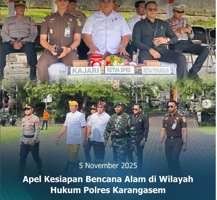 Rabu, 5 November 2025 — Kepala Kejaksaan Negeri Karangasem yang diwakili oleh Kasubsi I Intelijen Kejari Karangasem, Ardi Putra Dewa Agung, S.H., M.H., menghadiri kegiatan Apel Kesiapan Bencana Alam di Wilayah Hukum Polres Karangasem.