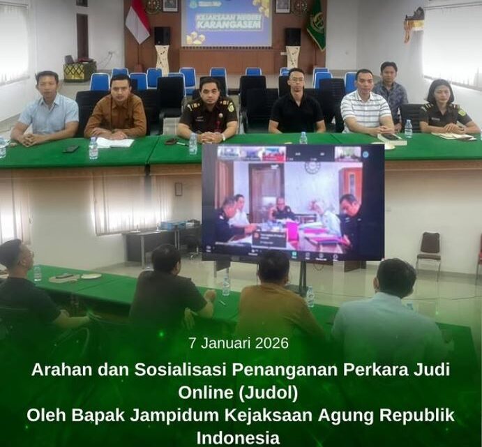 Rabu, 7 Januari 2026 Kejaksaan Negeri Karangasem mengikuti arahan dan sosialisasi perkara judi online (judol) yang diikuti oleh Plh. Kepala Seksi Tindak Pidana Umum, Kepala Subseksi Tindak Pidana Umum, Kepala Subseksi Intelijen, Jaksa Fungsional, Calon Jaksa. Kegiatan ini dilaksanakan dalam rangka pembahasan penanganan perkara tindak pidana judi online sebagai bentuk komitmen institusi dalam merespons perkembangan kejahatan siber yang semakin kompleks. Kegiatan ini menjadi forum strategis untuk memberikan arahan, menyamakan persepsi, serta memperkuat pemahaman aparat penegak hukum terhadap pola, modus, dan tantangan dalam penanganan perkara judi online secara profesional dan berintegritas.