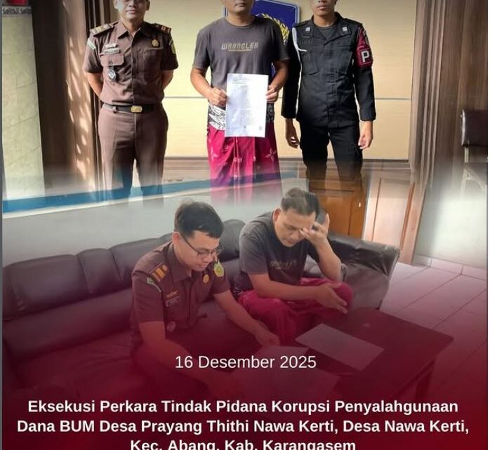 Selasa, 16 Desember 2025 Jaksa Eksekutor pada Bidang Tindak Pidana Khusus Kejaksaan Negeri Karangasem telah melakukan eksekusi perkara tindak pidana korupsi penyalahgunaan Dana BUM Desa Prayang Thithi Nawa Kerti terhadap 1 (satu) orang Terpidana pada Lapas Kelas II B Karangasem, dengan inisial “IWS” berdasarkan putusan pengadilan yang telah berkekuatan hukum tetap (inkracht van gewijsde) dan terhadap terpidana tersebut diwajibkan untuk melakukan pembayaran uang pengganti sebagai bentuk upaya pemulihan kerugian keuangan negara yang telah ditimbulkan.