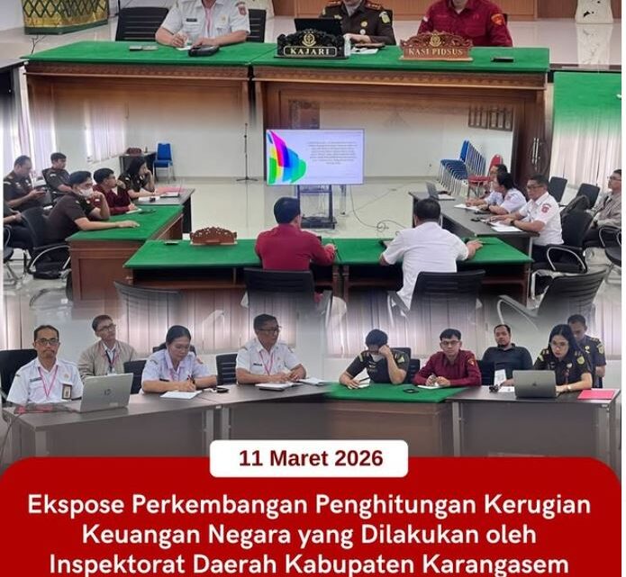 Rabu, 11 Maret 2026 telah dilaksanakan ekspose perkembangan penghitungan kerugian keuangan negara yang dilakukan oleh Inspektorat Daerah Kabupaten Karangasem terhadap salah satu perkara penyidikan yang sedang di tangani Bidang Pidsus Kejaksaan Negeri Karangasem. Ekspose ini dihadiri oleh Kepala Kejaksaan Negeri Karangasem beserta tim Penyidik Pidsus Kejaksaan Negeri Karangasem selain itu dihadiri juga oleh Inspektur Daerah Kabupaten Karangasem beserta tim