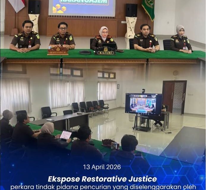 Senin, 13 April 2026, Kepala Kejaksaan Negeri Karangasem bersama Kepala Seksi Tindak Pidana Umum, Kepala Seksi Pemulihan Aset dan Pengelolaan Barang Bukti, Kepala Subseksi Penuntutan, Eksekusi, dan Eksaminasi, serta Jaksa Fungsional pada Bidang Tindak Pidana Umum Kejaksaan Negeri Karangasem, mengikuti kegiatan ekspose Restorative Justice dalam perkara tindak pidana pencurian yang diselenggarakan oleh Kejaksaan Negeri Badung melalui Zoom Meeting.