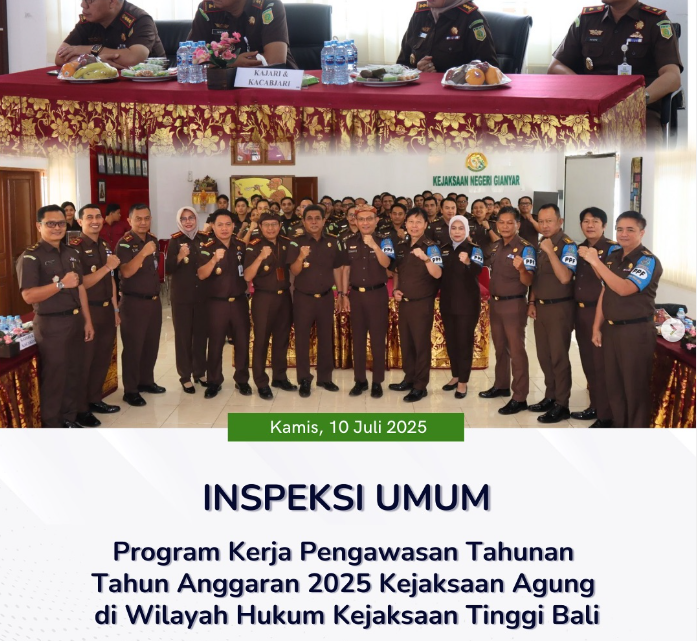 Kamis, 10 Juli 2025 bertempat di Kejaksaan Negeri Gianyar, Kepala Kejaksaan Negeri Karangasem Suwirjo, S.H., M.H., beserta para Kasi dan Kasubagbin menerima kunjungan Plt. Inspektur III Pada Jaksa Agung Muda Bidang Pengawasan Drs. Muhammad Naim S.H., M.H., beserta Inspektur Muda dan para Pemeriksa Inspektorat III pada Jaksa Agung Muda Pengawasan dalam Pelaksanaan Inspeksi Umum Program Kerja Pengawasan Tahunan Tahun Anggaran 2025 Kejaksaan Agung di wilayah Hukum Kejaksaan Tinggi Bali.