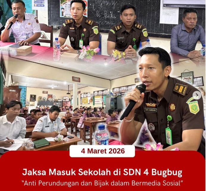 Rabu, 4 Maret 2026, Kejaksaan Negeri Karangasem kembali hadir di tengah dunia pendidikan melalui program Jaksa Masuk Sekolah (JMS) yang kali ini dilaksanakan di SD Negeri 4 Bugbug. Mengusung tema “Anti Perundungan dan Bijak dalam Bermedia Sosial,” kegiatan ini menjadi wujud nyata komitmen kejaksaan dalam menanamkan kesadaran hukum sejak dini kepada para pelajar.