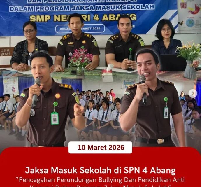Selasa, 10 Maret 2026 Dalam rangka meningkatkan kesadaran dan pemahaman hukum di kalangan pelajar, Kejaksaan Negeri Karangasem melaksanakan kegiatan Jaksa Masuk Sekolah (JMS) dengan tema “Pencegahan Perundungan (Bullying) dan Pendidikan Anti Korupsi.”
