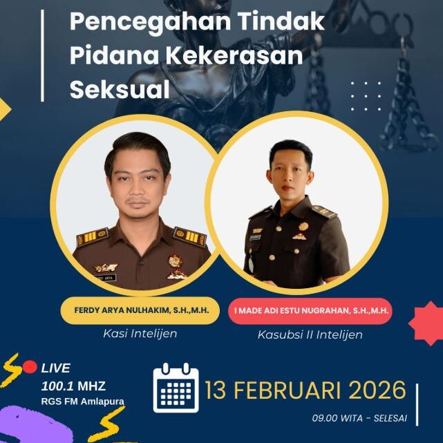 Kejaksaan Negeri Karangasem hadir dalam program Jaksa Menyapa dengan tema “Pencegahan Tindak Pidana Kekerasan Seksual.” Kegiatan ini disiarkan secara langsung sebagai bentuk edukasi hukum kepada masyarakat terkait upaya pencegahan dan penanganan tindak pidana kekerasan seksual.