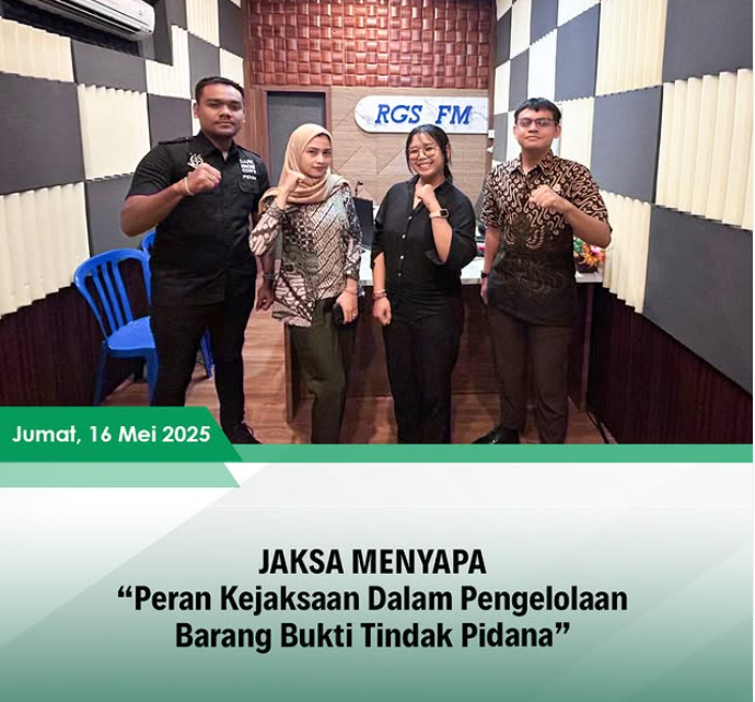 Jumat, 16 Mei 2025, bertempat di Studio Radio RGS FM Amlapura 100.1 MHz, Kasubsi Penuntutan dan Eksekusi dan Eksaminasi Kejaksaan Negeri Karangasem, Dewa Gede Angga Pratipta, S.H., Kasubsi Penuntutan, Upaya Hukum Luar Biasa dan Eksekusi Kejaksaan Negeri Karangasem, Robetus Deka Nanda Arwinsta, S.H., dan Staf PAPBB Kejaksaan Negeri Karangasem, Nevi Erlina, A.Md.A.B., melaksanakan kegiatan Jaksa Menyapa dengan tema “Peran Kejaksaan Dalam Pengelolaan Barang Bukti Tindak Pidana”.