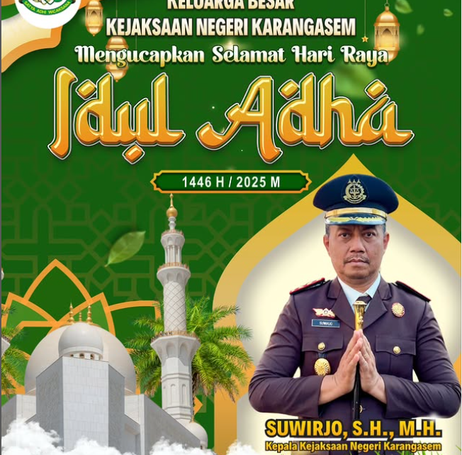 Kepala Kejaksaan Negeri Karangasem, Suwirjo, S.H., M.H., beserta Keluarga Besar Kejaksaan Negeri Karangasem Mengucapkan Selamat Hari Raya Idul Adha 1446 H/2025 M.
