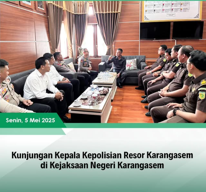 Senin, 5 Mei 2025, bertempat di Kantor Kejaksaan Negeri Karangasem, Kepala Kejaksaan Negeri Karangasem, Suwirjo, S.H., M.H., didampingi para Kepala Seksi pada Kejaksaan Negeri Karangasem menerima kunjungan dari Kepala Kepolisian Resor Karangasem, AKBP Joseph Edward Purba, S.H., S.I.K., M.H., beserta jajaran.