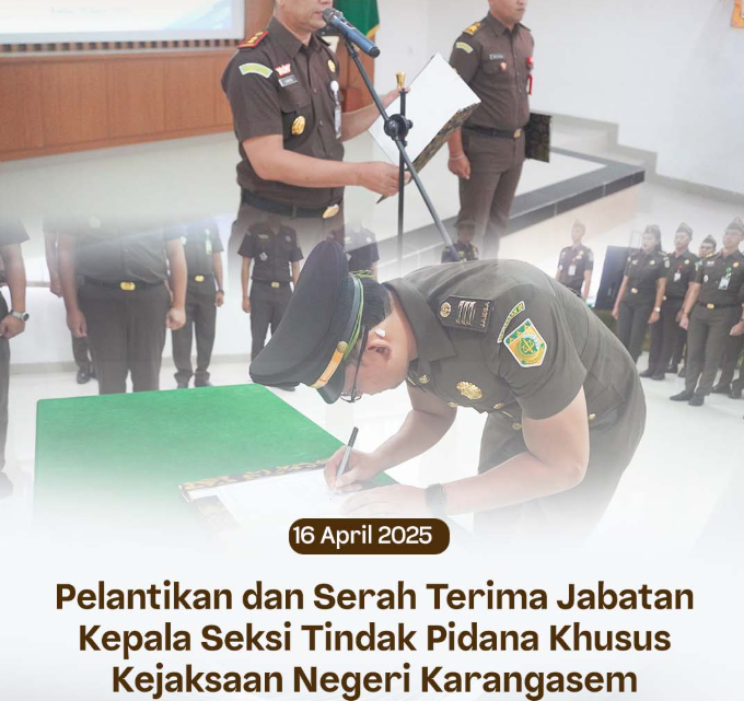 Rabu, 16 April 2025, bertempat di Aula Kantor Kejaksaan Negeri Karangasem dilaksanakan kegiatan Pelantian dan Serah Terima Jabatan Kepala Seksi Tindak Pidana Khusus Kejaksaan Negeri Karangasem.