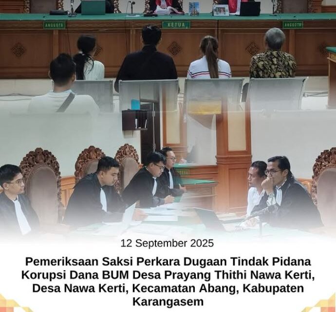 Jumat, 12 september 2025 Bertempat di Pengadilan Tindak Pidana Korupsi pada Pengadilan Negeri Denpasar Kelas IA Khusus telah dilaksanakan Sidang dengan Agenda Pemeriksaan saksi dari Pengurus BUM Desa dan Perbekel tahun 2016 sampai dengan tahun 2022 oleh Jaksa Penuntut Umum yang berjumlah 5 (lima) orang saksi dalam Perkara Dugaan Tindak Pidana Korupsi Dana BUM Desa Prayang Thithi Nawa Kerti, Desa Nawa Kerti, Kec. Abang, Kab. Karangasem.