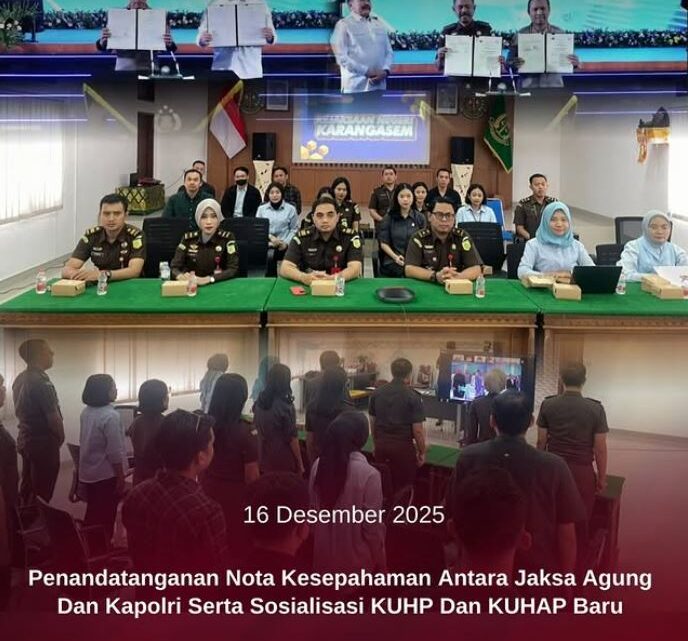 Selasa, 16 Desember 2025, Kejaksaan Negeri Karangasem mengikuti Sinergitas Penguatan Pemahaman dan Persamaan Persepsi Antar Aparat Penegak Hukum Terhadap KUHP Baru serta Penandatanganan Nota Kesepahaman / Perjanjian Kerja Sama Antara Kejaksaan Republik Indonesia dan Kepolisian Negara Republik Indonesia.
