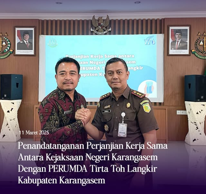 Pada hari Selasa, tanggal 11 Maret 2025 bertempat di Aula Kejaksaan Negeri Karangasem telah dilaksanakan Penandatanganan Perjanjian Kerjasama antara Kejaksaan Negeri Karangasem dengan PERUMDA Tirta Toh Langkir Kabupaten Karangasem yang dihadiri Direktur PERUMDA Tirta Toh Langkir Kab. Karangasem, I Komang Haryadi Parwatha, S.H., berserta jajaran dan Kepala Kejaksaan Negeri Karangasem, Suwirjo, S.H., M.H., yang didampingi oleh Kepala Seksi Perdata dan Tata Usaha Negara. Apri Ando Simanjuntak, S.H., M.H. beserta Tim Jaksa Pengacara Negara.