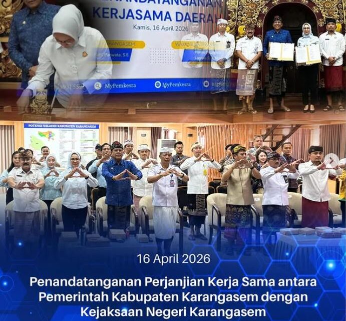 Kamis, 16 April 2026, Kepala Kejaksaan Negeri Karangasem, Shinta Ayu Dewi RR, S.H., M.H., bersama Bupati Karangasem, I Gusti Putu Parwata, S.E., melaksanakan penandatanganan perjanjian kerja sama antara Pemerintah Kabupaten Karangasem dengan Kejaksaan Negeri Karangasem.