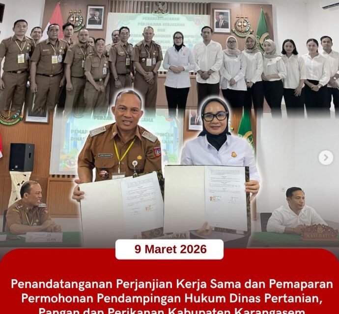 Senin, 9 Maret 2026 Kepala Kejaksaan Negeri Karangasem, Ibu Shinta Ayu Dewi RR, S.H., M.H., mengikuti kegiatan Penandatanganan Perjanjian Kerja Sama serta Pemaparan Permohonan Pendampingan Hukum dari Dinas Pertanian, Pangan dan Perikanan Kabupaten Karangasem