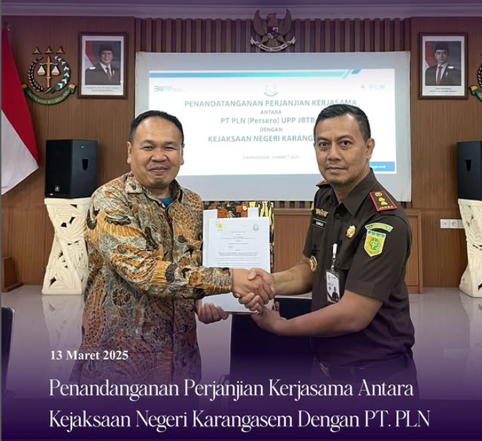 Kamis,13 Maret 2025 bertempat di Aula Kejaksaan Negeri Karangasem telah dilaksanakan Penandatanganan Perjanjian Kerjasama antara Kejaksaan Negeri Karangasem dengan PT.PLN (PERSERO) UPP JBTB 4, yang dihadiri Manajer PT.PLN (PERSERO) UPP JBTB 4, Eko Janu Irianto berserta jajaran dan Kepala Kejaksaan Negeri Karangasem, Suwirjo, S.H., M.H., yang didampingi oleh Kepala Seksi Perdata dan Tata Usaha Negara. Apri Ando Simanjuntak, S.H., M.H. beserta Tim Jaksa Pengacara Negara.