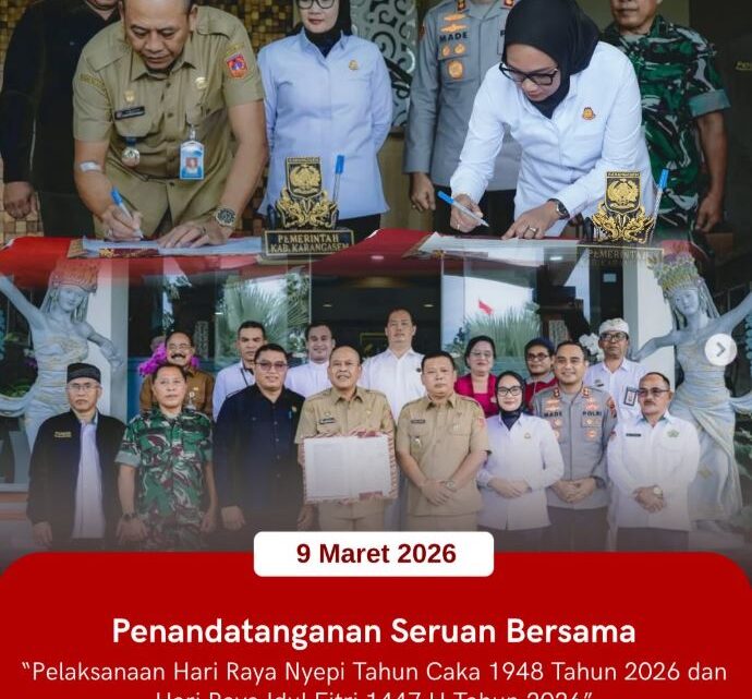 Senin, 9 Maret 2026 Kepala Kejaksaan Negeri Karangasem, Shinta Ayu Dewi RR, S.H., M.H., menghadiri kegiatan Penandatanganan Seruan Bersama Pelaksanaan Hari Raya Nyepi Tahun Baru Caka 1948 Tahun 2026 dan Hari Raya Idul Fitri 1447 H Tahun 2026 sebagai bentuk komitmen bersama dalam menjaga keamanan, ketertiban, serta kerukunan umat beragama di Kabupaten Karangasem.