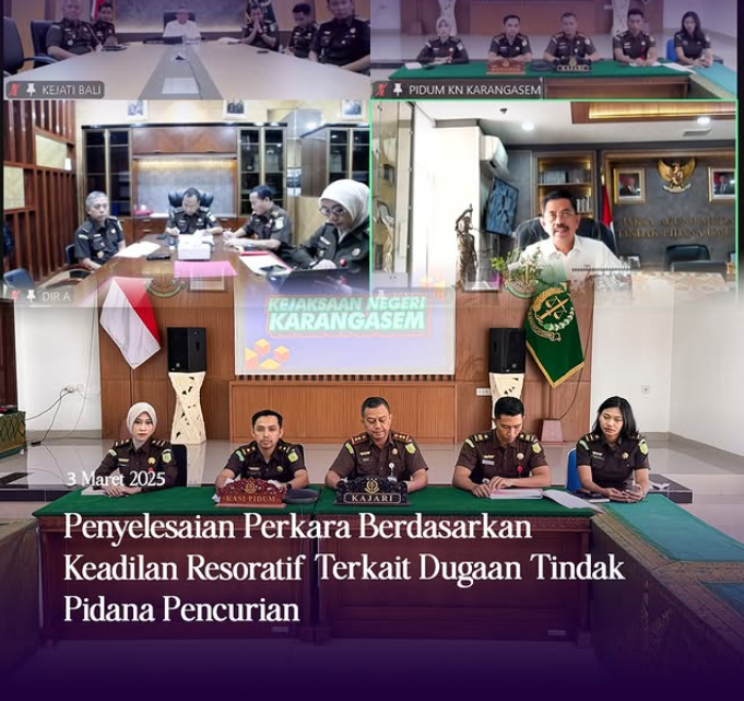 Senin, 3 Maret 2025, pemaparan permohonan penghentian penuntutan berdasarkan keadilan Restorative Justice dilakukan oleh Kepala Kejaksaan Tinggi Bali, Dr. Ketut Sumedana, S.H., M.H., secara virtual dari ruang rapat Kejaksaan Tinggi Bali, didampingi Koordinator pada Tindak Pidana Umum Kejati Bali, M. F. Hasibuan, S.H., M.H., M.M., Koordinator, beserta para Kasi.