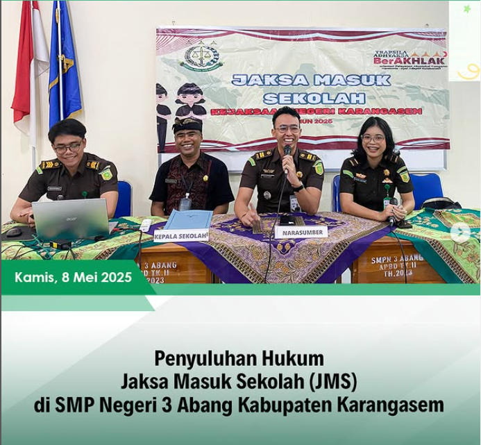 Kamis, 8 Mei 2025, bertempat di SMP Negeri 3 Abang, Kasubsi I Intelijen Kejaksaan Negeri Karangasen, Ardi Putra Dewa Agung, S.H., dan Jaksa Fungsional Intelijen, Rachel Chelsia Gautama, S.H., menjadi Narasumber dalam kegiatan Jaksa Masuk Sekolah dengan tema “Pencegahan Perundungan (Bullying) Di Lingkungan Sekolah. Tujuan kegiatan ini untuk memperkuat literasi hukum di kalangan pelajar, tenaga pendidik, serta pengelola sekolah.