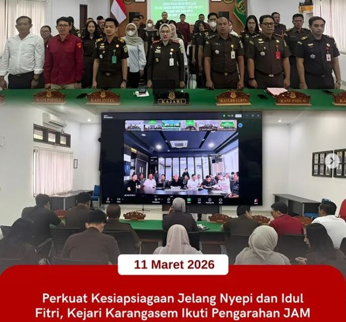 Rabu, 11 Maret 2026 Sehubungan dengan menyambut Hari Raya Nyepi (Tahun Baru Saka 1948) dan Hari Raya Idul Fitri 1447 H, telah dilaksanakan kegiatan Pengarahan Jaksa Agung Muda Intelijen secara virtual (daring) yang diikuti oleh seluruh jajaran Kejaksaan di Indonesia.