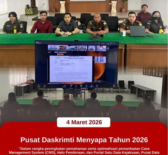 Rabu, 4 Maret 2026 Dalam rangka meningkatkan pemahaman serta optimalisasi pemanfaatan Case Management System (CMS), Halo Pembinaan, dan Portal Satu Data Kejaksaan, Pusat Data Statistik Kriminal dan Teknologi Informasi (Pusat Daskrimti) menyelenggarakan kegiatan “Pusat Daskrimti Menyapa” Tahun 2026.