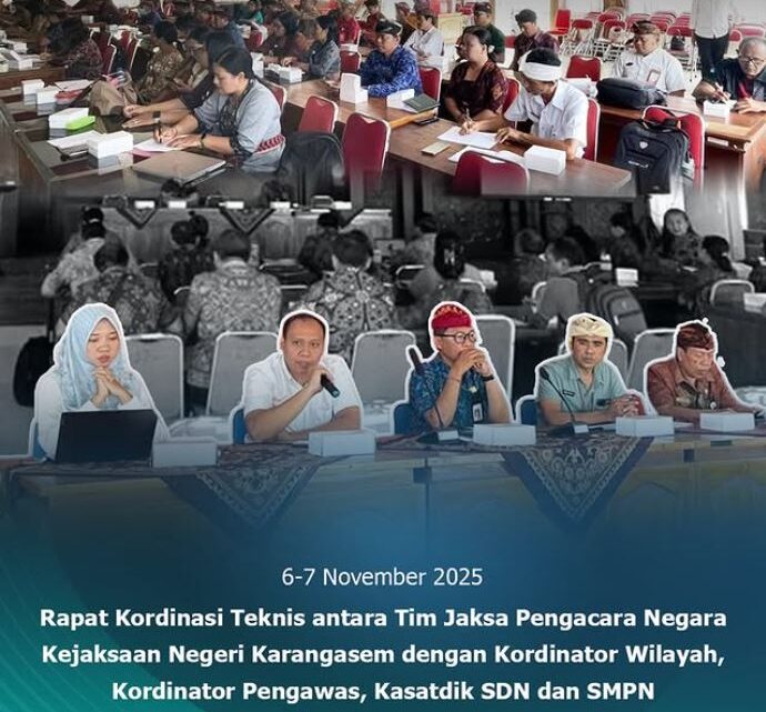 Pada hari Kamis dan Jumat, tanggal 6 dan 7 November 2025 bertempat di Aula Rapat Kantor Dinas Pendidikan Kepemudaan dan Olahraga telah dilaksanakan rapat koordinasi teknis antara Tim Jaksa Pengacara Negara Kejaksaan Negeri Karangasem dengan Koordinator Wilayah, Koordinator Pengawas, Kasatdik SDN dan SMPN se-Kabupaten Karangasem