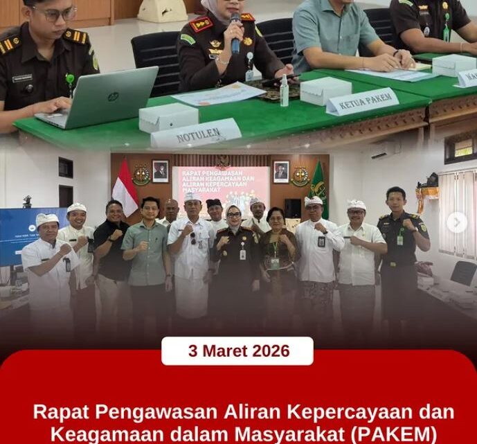 Selasa, 3 Maret 2026 Kepala Kejaksaan Negeri Karangasem, Shinta Ayu Dewi RR, S.H., M.H., selaku Ketua Tim Pengawasan Aliran Kepercayaan dan Keagamaan dalam Masyarakat (PAKEM) Kabupaten Karangasem memimpin Rapat Koordinasi Tim PAKEM yang dilaksanakan di Aula Kantor Kejaksaan Negeri Karangasem.
