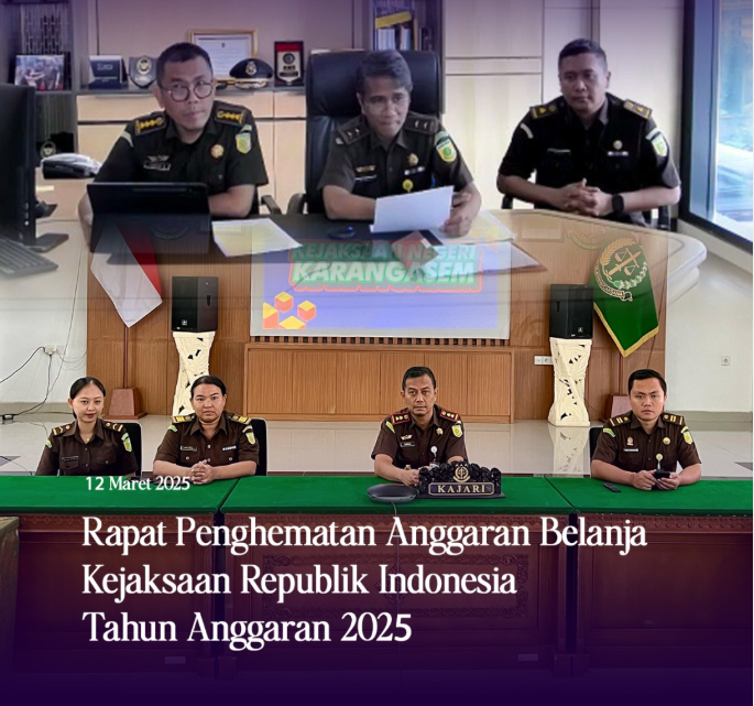 Rabu, 12 Maret 2025 bertempat di Aula Kejaksaan Negeri Karangasem, Kepala Kejaksaan Negeri Karangasem Suwirjo, S.H., M.H. didampingi Jajaran Bidang Pembinaan Kejaksaan Negeri Karangasem mengikuti Video Conference prihal Rapat Penghematan Anggaran Belanja Kejaksaan Republik Indonesia Tahun Anggaran 2025 yang membahas mengenai Penghematan Anggaran Belanja Kejaksaan Republik Indonesia dan dilaksanakan langsung oleh Kepala Biro Perencanaan Kejaksaan Agung Republik Indonesia.