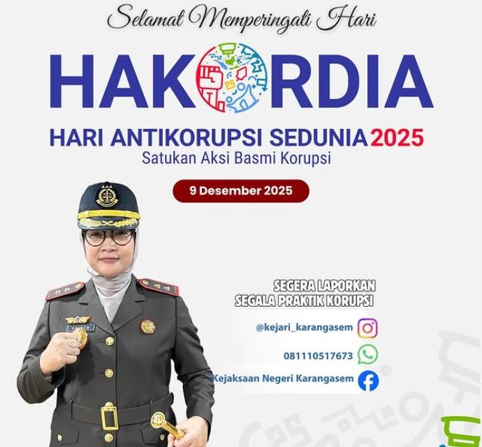 Kepala Kejaksaan Negeri Karangasem, Shinta Ayu Dewi RR, S.H., M.H., beserta seluruh jajaran mengucapkan selamat Hari Antikorupsi Sedunia (Hakordia) tahun 2025. Momentum ini menjadi pengingat untuk terus memperkuat komitmen penegakan hukum yang profesional, berintegritas, dan antikorupsi dalam mewujudkan tata kelola pemerintahan yang bersih, efektif, dan berkelanjutan.