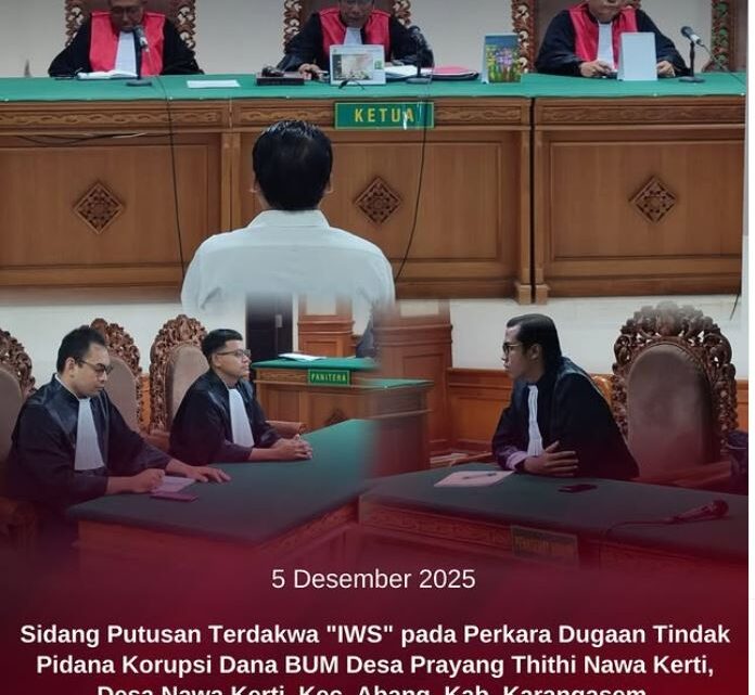Jumat, 5 Desember 2025 Jaksa Penuntut Umum Kejari Karangasem telah melaksanakan Sidang dengan agenda Putusan Terdakwa “IWS” dalam Perkara Dugaan Tindak Pidana Korupsi Dana BUM Desa Prayang Thithi Nawa Kerti, Desa Nawa Kerti, Kec. Abang, Kab. Karangasem pada Pengadilan Negeri Denpasar Kelas IA Khusus.