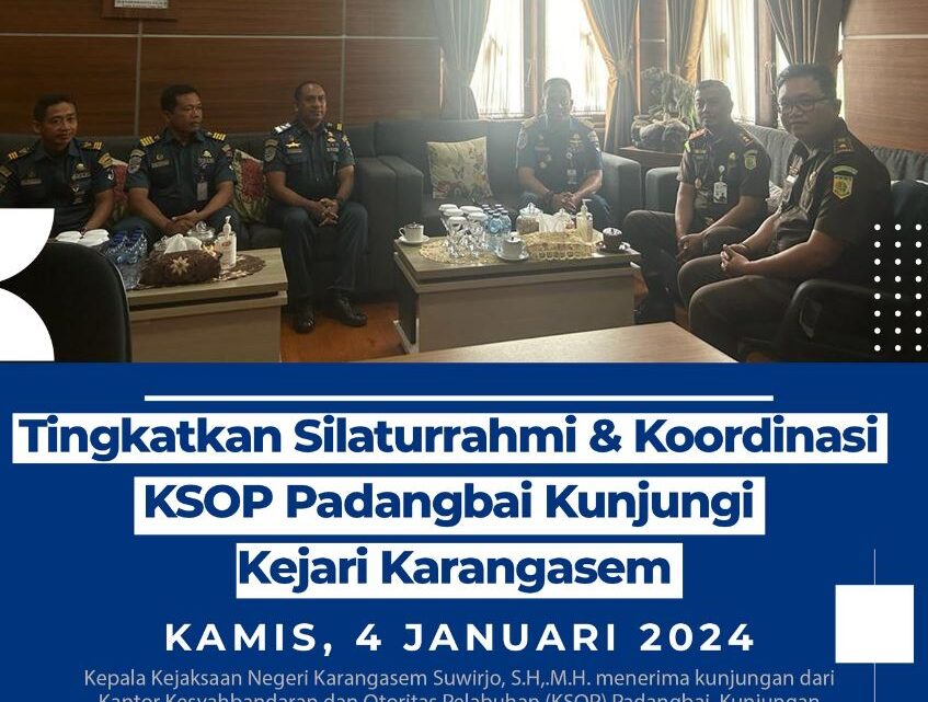 Pada hari Kamis, tanggal 4 Januari 2024 Kepala Kejaksaan Negeri Karangasem, Suwirjo, S.H.,M.H. didampingi oleh Kasi Intelijen, menerima kunjungan dari Kepala Kantor Kesyahbandaran dan Otoritas Pelabuhan (KSOP) beserta jajaran dalam rangka silaturrahmi dan koordinasi antara KSOP dan Kejari Karangasem.