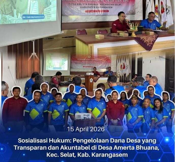 Rabu, 15 April 2026, Kejaksaan Negeri Karangasem yang diwakili oleh Kepala Seksi Tindak Pidana Khusus, I Gede Hady Sunantara, S.H., M.H., hadir sebagai narasumber dalam kegiatan yang diselenggarakan oleh Pemerintah Desa Amertha Bhuana, Kecamatan Selat, Kabupaten Karangasem.